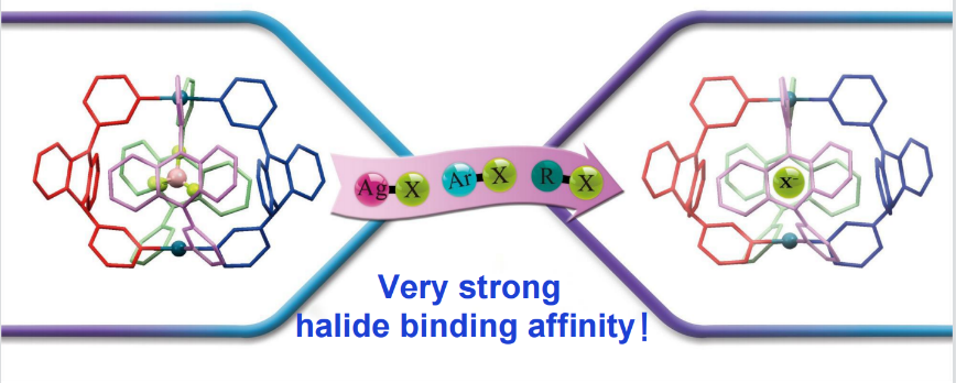 阴离子超分子化学在化合物提取、催化、传感、运输、阴离子模板合成以及超分子自组装等多个领域存在广泛应用。卤素阴离子在化学、生物、工业、环境等方面扮演重要角色,因此探索设计新型高亲和力的卤素离子受体并深入理解其独特的主-客体化学机制具有非常重要的学术价值和应用前景。相较于其他卤素离子受体,配位笼与卤素离子之间的主客体化学鲜有报道。近日,麻豆社