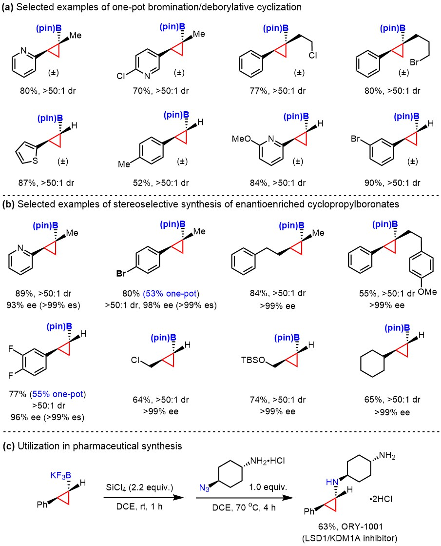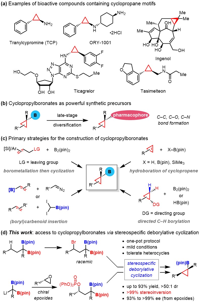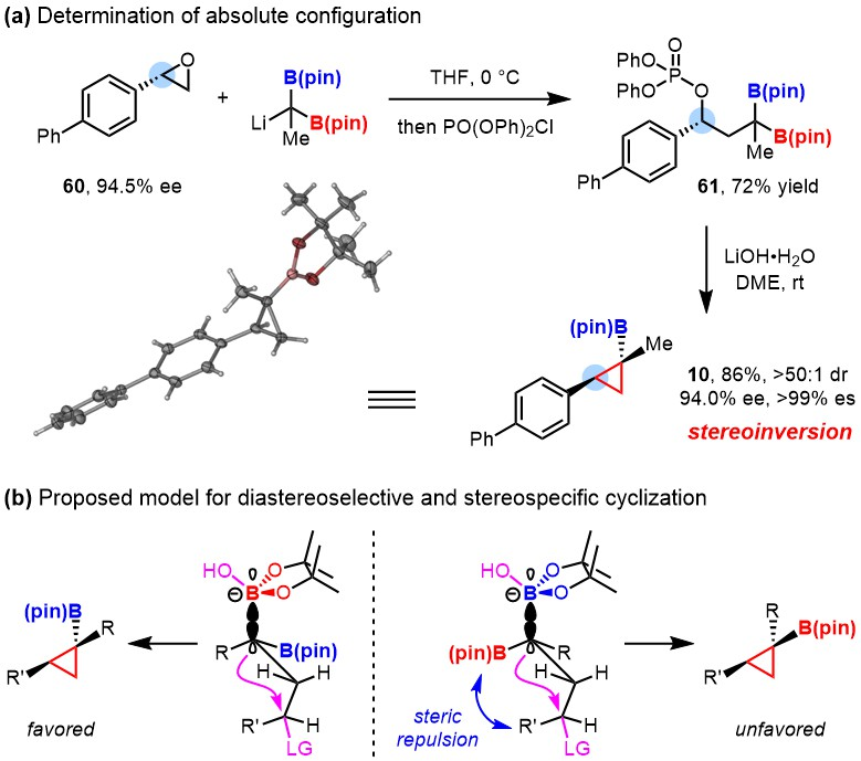 图2. 利用立体专一性的分子内关环反应实现环丙烷硼酸酯合成的新策略