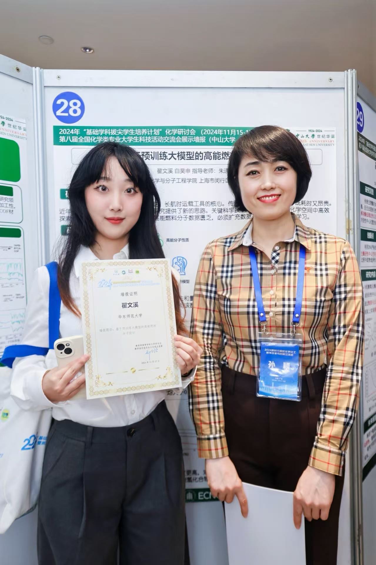 2024年11月15-17日,由中山大学承办的2024年“基础学科拔尖学生培养计划”化学研讨会暨第八届全国化学类专业大学生科技活动交流会在广州成功举行。我院2022级拔尖班三位同学张雍昕、翟文溪和孔得贤参加了此次学生之间的学术交流,获得了优秀报告以及优秀墙报奖。