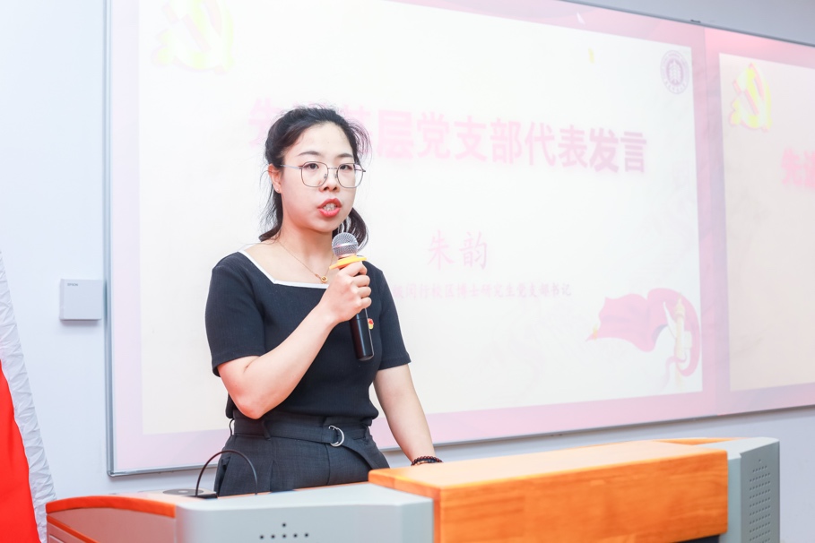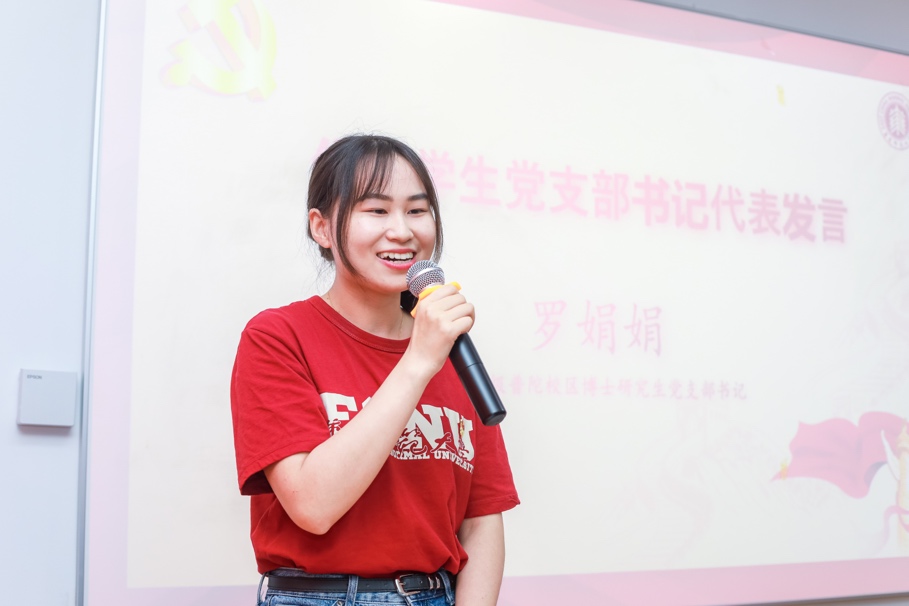 2021级普陀校区博士研究生党支部书记罗娟娟作为优秀党支部书记发言。罗娟娟首先表达了作为青年学生党支部书记所肩负的责任和使命,并向大家介绍了引领支部工作的特色经验,表达在今后的党建工作中,党支部的决心和勇气,和学生党员一起奏响“不负时代、不负韶华、不负党和人民殷切期望,扛起青春有我”的时代强音。