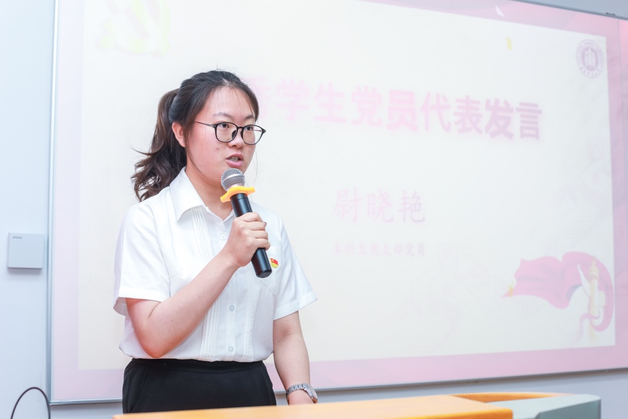 本科生党支部党员尉晓艳作为学生优秀共产党员代表发言。尉晓艳表示优秀共产党员是对自己的鞭策和鼓励,以后更需严格要求自己,并用“坚定理想、牢记使命;增长才干、奋发有为;勇于担当、脚踏实地”与学生党员一起感悟坚定不移跟党走,发挥党员先进性,将小我融入大我,为实现中华民族伟大复兴而努力奋斗的青春誓言。