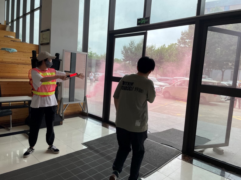 第二个环节是模拟火灾现场,进行消防演练。演练开始前,志愿者们到达被分配的各个楼层,准备就绪后吴昀非老师引燃烟雾弹,拉响消防警报。随后,志愿者们迅速疏散人员,引导师生逃生,参与消防演练的师生得以安全撤离。