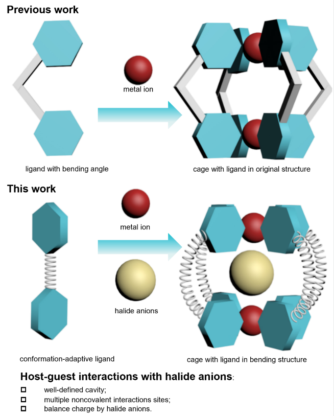 阴离子超分子化学在化合物提取、催化、传感、运输、阴离子模板合成以及超分子自组装等多个领域存在广泛应用。卤素阴离子在化学、生物、工业、环境等方面扮演重要角色,因此探索设计新型高亲和力的卤素离子受体并深入理解其独特的主-客体化学机制具有非常重要的学术价值和应用前景。相较于其他卤素离子受体,配位笼与卤素离子之间的主客体化学鲜有报道。近日,麻豆社