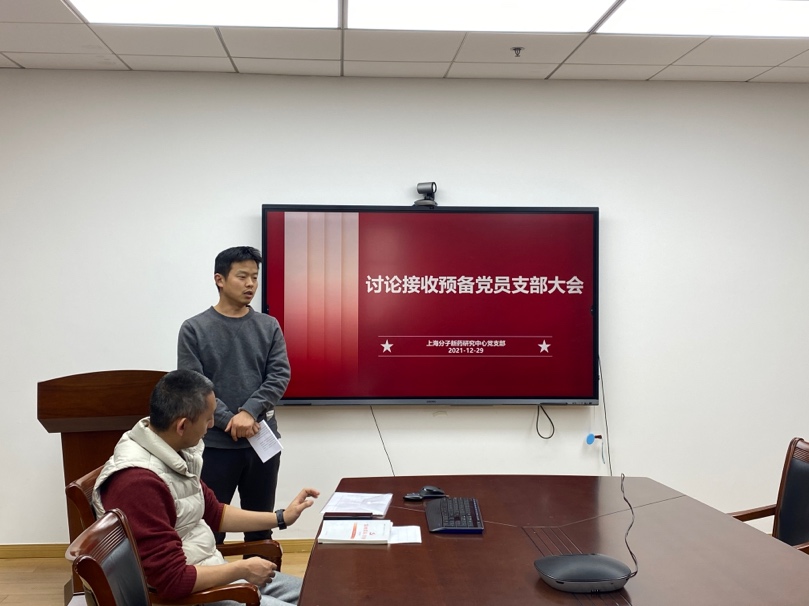 2021年12月29日,上海分子新药研究中心党支部在理科大楼B1602会议室召开支部大会,讨论接收预备党员和预备党员转正事宜。本次党员大会应到会具有表决权的正式党员26人,因事因病请假2人,实到会具有表决权的正式党员24人,有表决权的到会人数超过应到会有表决权人数的半数,符合程序规定。大会由支部书记张亮主持。