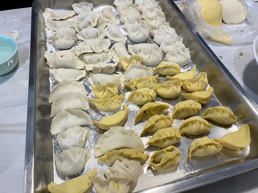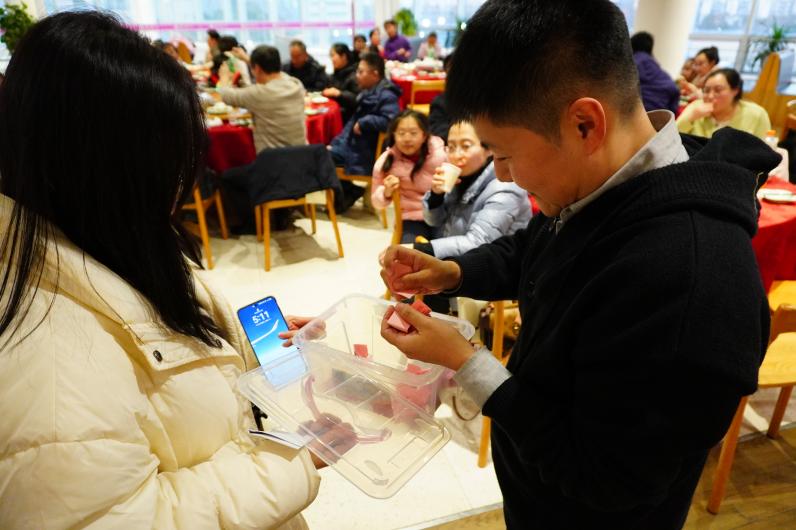 活动开始后,桌上已满是悉心备好的新鲜食材,缤纷馅料香气四溢,张张饺子皮排列齐整。老师们纷纷捋袖上阵,各展绝技:有的老师手法灵动,轻捻慢按,圆润精巧的饺子转瞬即成;有的老师独出心裁,制作出出花纹别致、造型新颖的饺子,惹来周遭声声夸赞。趁着难得的聚会时光,老师们也相互分享着一年来的生活妙趣与教学感悟。现场欢声笑语不断。