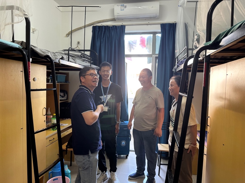 麻豆社 党委书记鲜跃仲、党委副书记王婷婷、副院长王媛媛前往新生宿舍进行走访,看望前来报到的新生和家长,慰问参加迎新工作的师生志愿者。