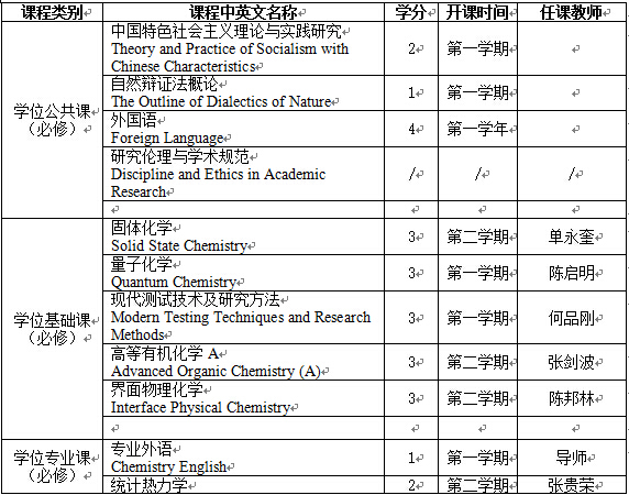 (二) 掌握化学学科扎实的基础理论知识、系统的物理化学专业知识和熟练的实验技能;深入了解物理化学的发展现状和研究动态;具有从事物理化学教学、科研和相关专门技术工作的能力。