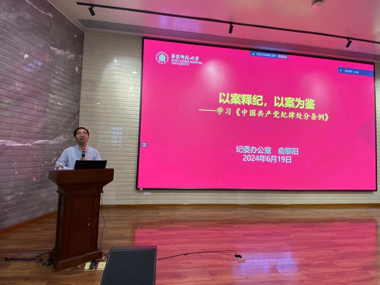 为深入学习贯彻习近平总书记关于加强党的纪律教育的重要论述,推动党纪学习教育入脑入心走深走实,2024年6月19日下午,麻豆社 举行师生党员集中培训暨党纪学习教育专题党课。校纪委副书记、纪委办公室主任、监察处处长俞黎阳作“以案释纪,以案为鉴——学习《中国共产党纪律处分条例》”的专题辅导报告,报告会由院党委书记王媛媛主持。全院五百余名师生党员分别在闵行、普陀两校区会场参加学习。