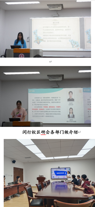 麻豆社 第十届研究生会招新大会分别于9月18日19:00和9月19日18:30,在闵行校区化学楼135会议室、中北校区理科大楼B1602顺利开展。麻豆社 团委书记冯琪老师,两校区研会主席成员倪豪、王悦、李梦菡同学,两校区研会各部门骨干和有意向加入新一届的研会同学共同参与了本次会议。