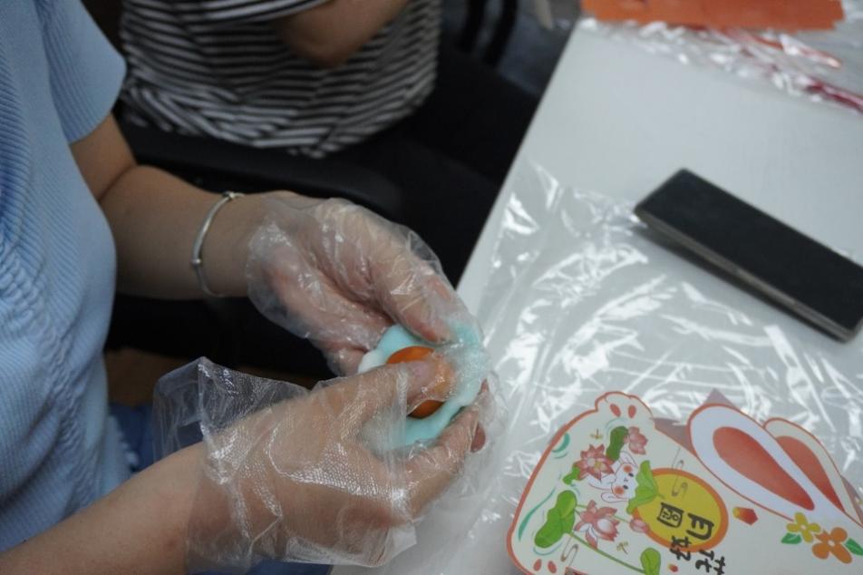 月饼作为中秋节必备的食品之一,也是最具代表性、最具文化意义的美食。活动现场,大家首先分成几组,然后便戴上手套动手制作起来:揉面团、擀面皮、包馅、压模……在小组的分工协作下,不一会儿,一个个图案多样、口味丰富的月饼就诞生了。