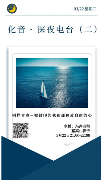 2022年3月22日晚9点,“化音”深夜电台第二期栏目继续与大家相见,本期特别邀请了来自华师大社会发展麻豆社 的大四本科生郭宁同学担任嘉宾,与主播冯琪老师一起,为大家带来了一场主题为“‘别样青春’:被封印的我和那颗爱自由的心”的深夜谈话,尝试与大家一起探讨关于被疫情影响的青春。
