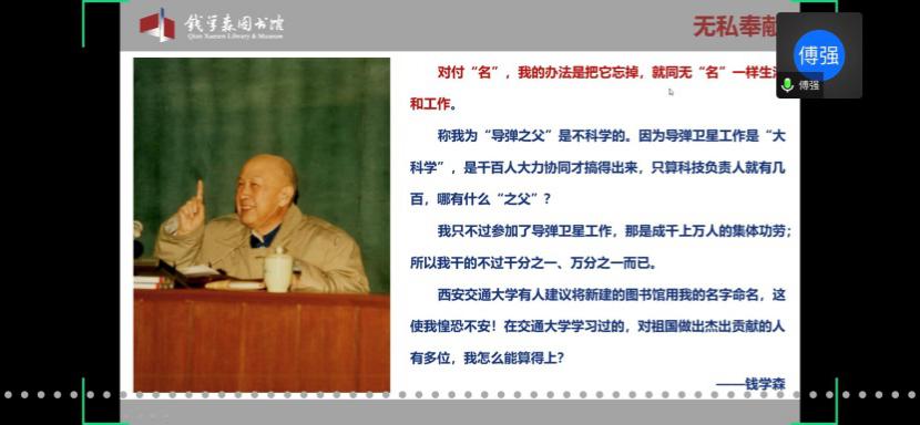馆内基本展览分为“中国航天事业奠基人”、“科学技术前沿的开拓者”、“人民科学家风范”和“战略科学家的成功之道”四个部分。在傅老师的带领下,学员们通过网络360°全景参观了钱馆,领略了作为优秀共产党员的钱学森先生的高贵品质,理解了“不忘初心,牢记使命”的深刻内涵。傅老师也欢迎大家在疫情结束后,到华山路1800号钱馆实地参观。