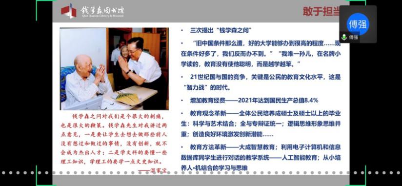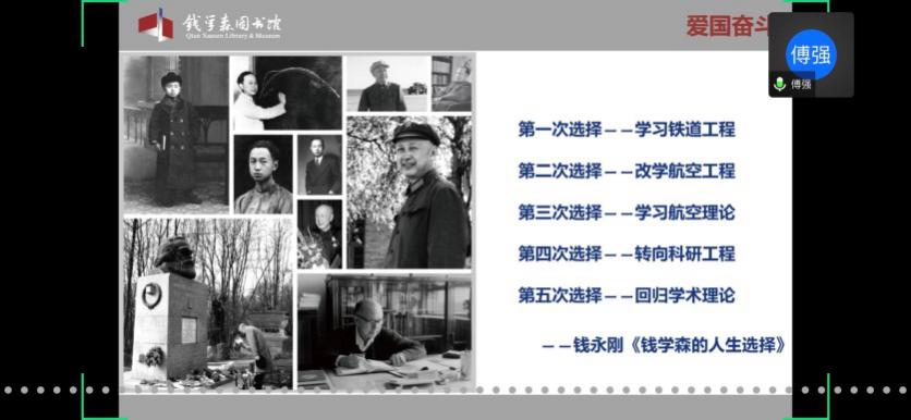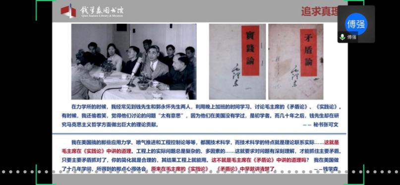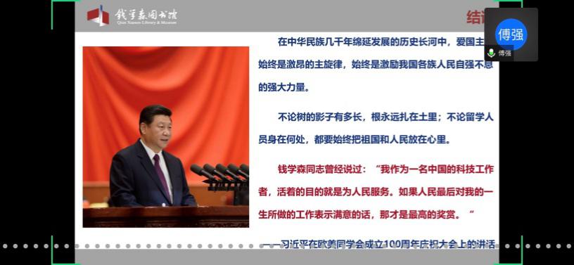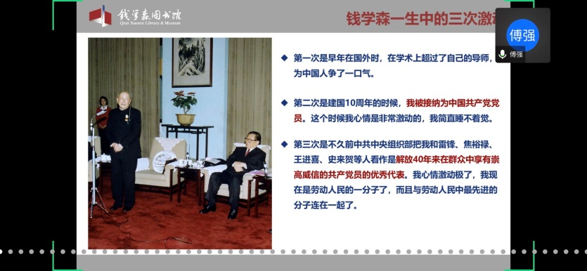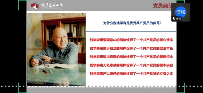 首先,童老师欢迎并介绍了本次党校培训班的主讲嘉宾傅强老师。傅老师是上海交通大学钱学森图书馆社教宣传部部长、副研究馆员,也是中国浦东干部麻豆社 课外教学点教员、上海市委宣传部东方讲坛特约讲师、资深博物馆教育工作者。本次党校培训班的内容包括两个板块,第一版块是依托钱学森图书馆(以下简称钱馆)“虚拟漫游馆”,由傅强老师带领学员们“云导览”;第二版块是题为“优秀共产党员——人民科学家钱学森”的主题报告。