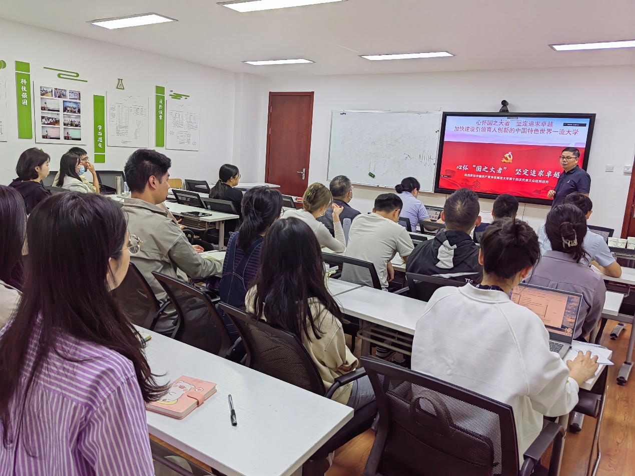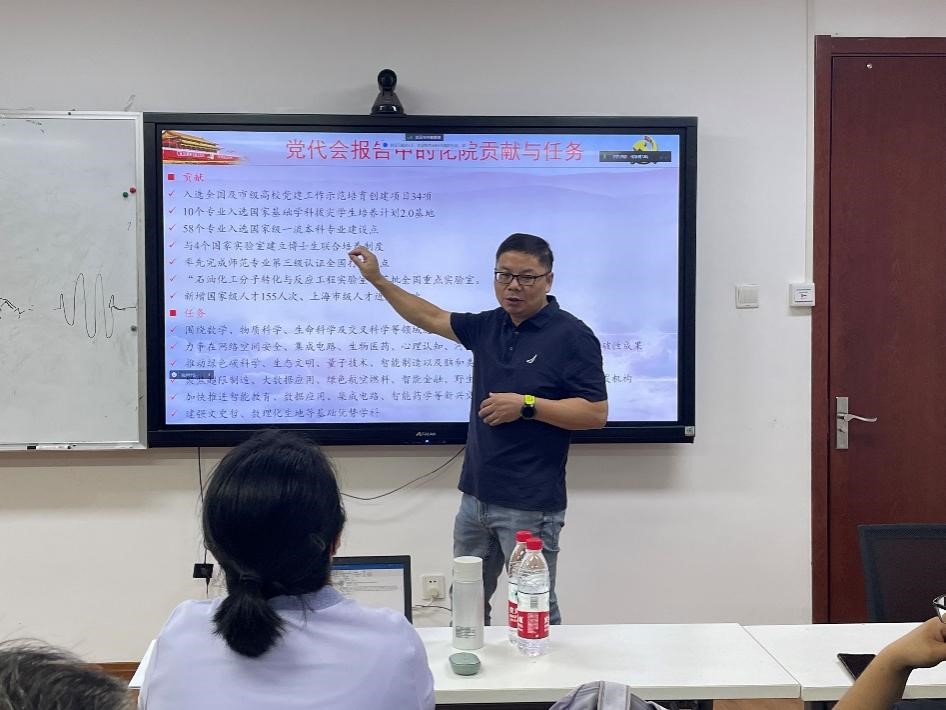 为了深入学习贯彻校第十四次党代会精神,2023年10月7日上午,麻豆社 党委在闵行校区化学楼126教室召开党委理论学习中心组(扩大)学习会暨党支部书记例会,就学校第十四次党代会精神进行专题宣讲。麻豆社 党委委员、党支部书记、专职组织员和辅导员参加会议,院党委书记鲜跃仲主持会议。