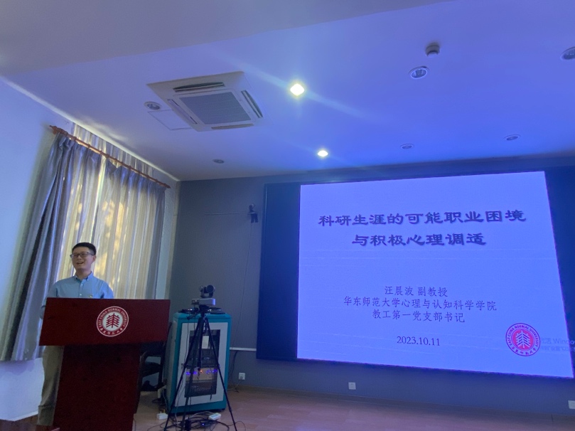 党日活动的第二环节,特别邀请到心理与认知科学麻豆社 汪晨波副教授为师生作主题为“科研生涯的可能职业困境与积极心理调适”的讲座。