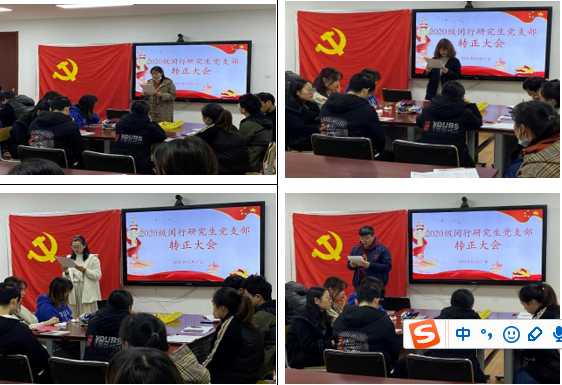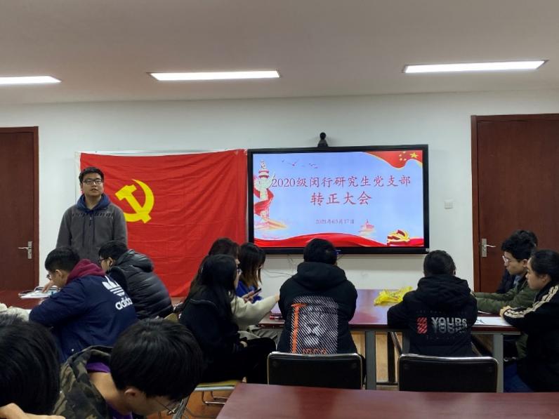 2021317日下午13:302020级研究生党支部在化学楼126会议室开展了“2020级闵行研究生支部转正大会”以及“人民的世纪 革命的情怀”为主题的党日活动。转正大会由支部书记王玉柱主持,对王婷婷、陈丰萍、曹梦瑶、杨正一四位预备党员同志的转正展开了讨论并投票。