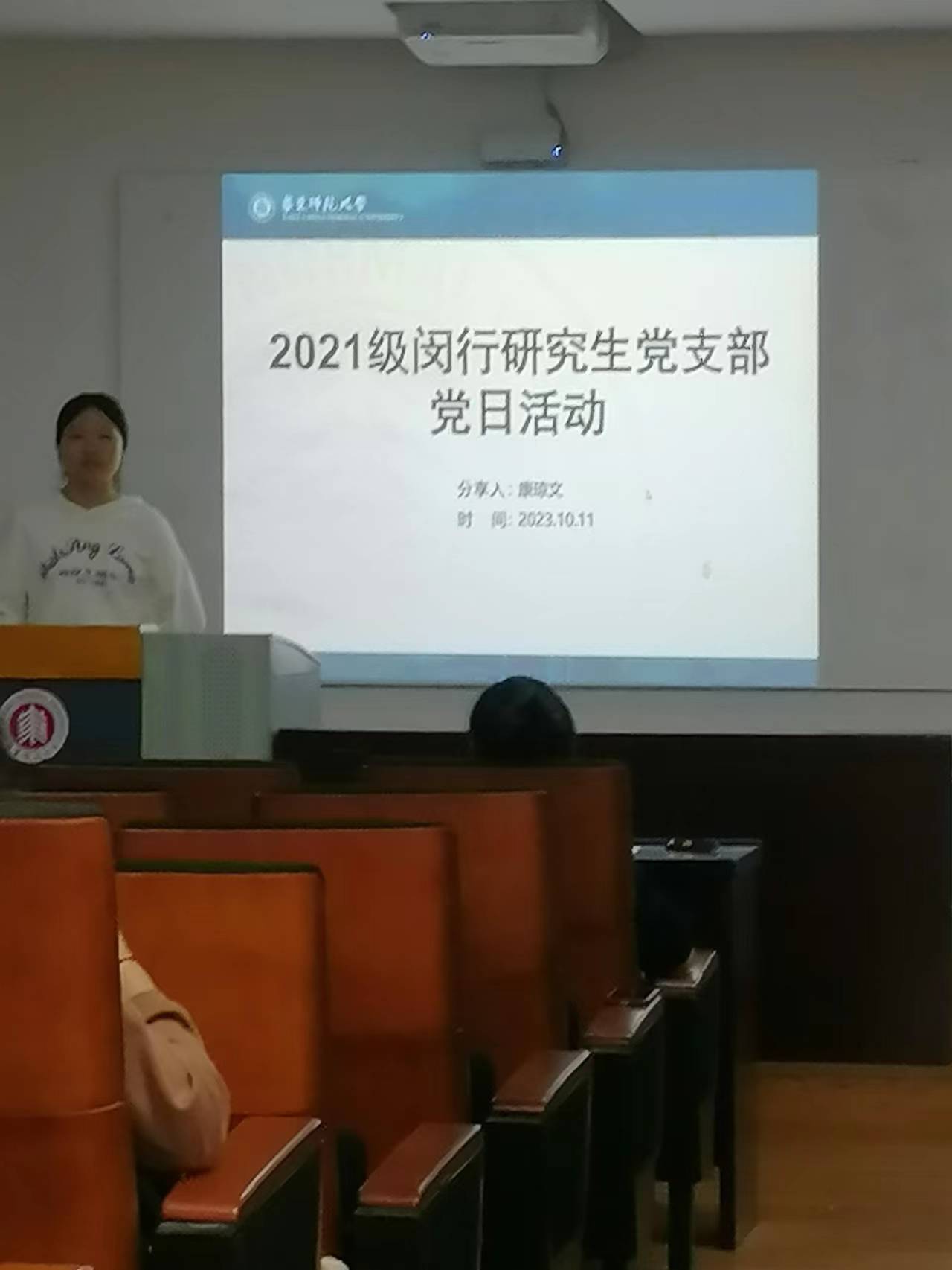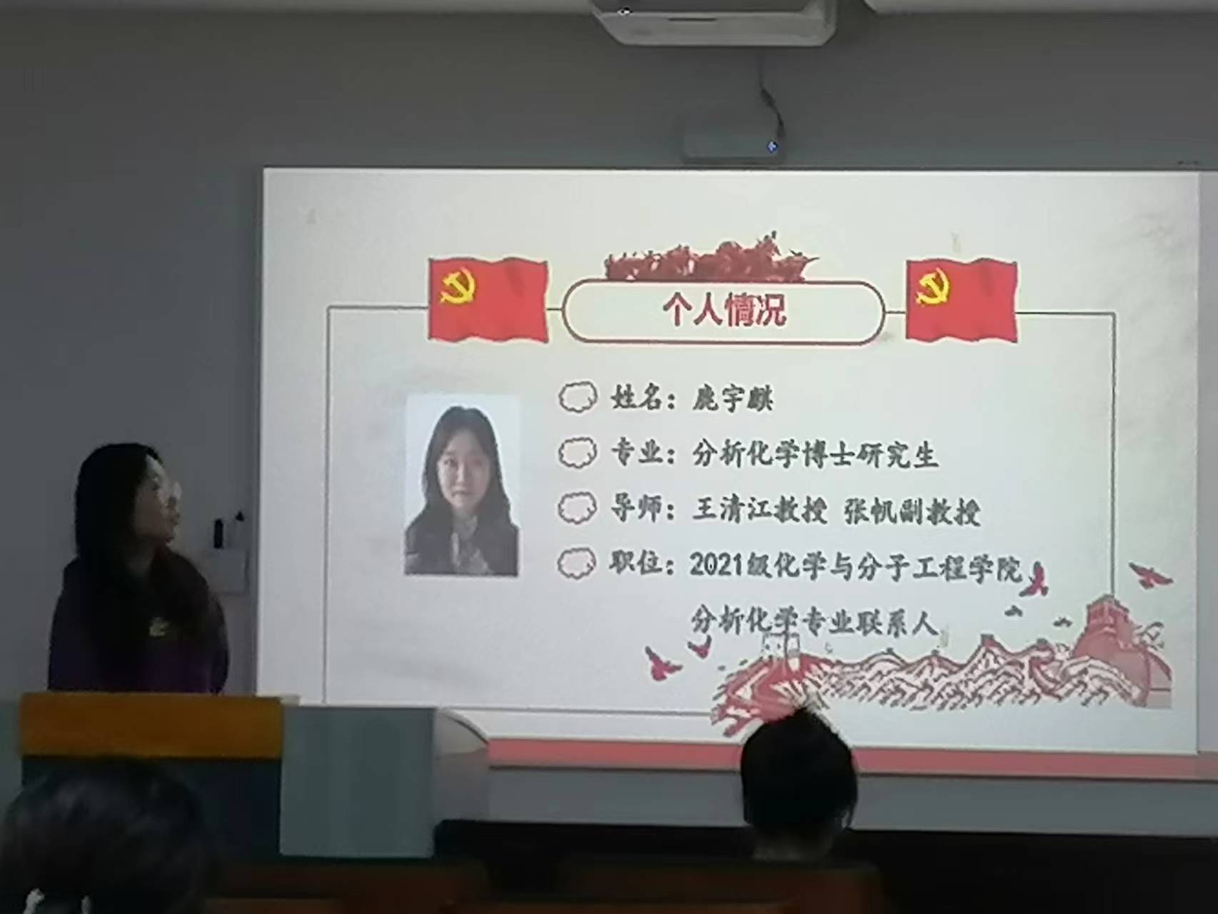 随后,学生支部的党员代表就科研、学习展开了精彩的分享。裴昊老师课题组2021级博士研究生朱韵做了科研分享,展示了研究课题的突破性,科研压力与动力无缝衔接,并透露了“慢就是快”的小秘诀。王清江老师课题组2021级博士研究生鹿宇麒做了学生工作分享。她的硕士与博士都是在我院就读,硕士阶段担任院研会文艺部干事、部长,博士阶段担任2021级分析化学专业联系人。鹿宇麒谈了自己不同的阶段有不同的感悟与精彩,科研工作与自身特长发展兼顾。2021级硕士研究生康琼文谈起科研习惯方面,信念、情绪、效率能量满满,脸上洋溢着阳光与自信。2021级硕士研究生陈文艺从完备组织建设、学术创业并进、丰富文体活动、做好权益服务、工作总结五个维度全面介绍了自己在麻豆社 研会工作的日常。优秀的人总有相似,又与众不同!