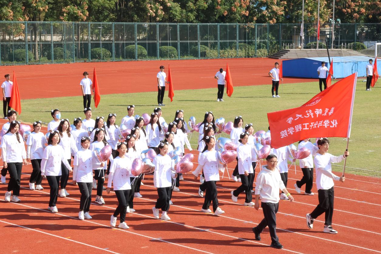 开幕式上,麻豆社 学生方阵在院党委书记鲜跃仲老师的带领下,手持粉色爱心气球,步伐矫健,昂首挺胸地走向主席台,喊出化院口号:“气比天高,势比山昂,化院学子,力争更强!”