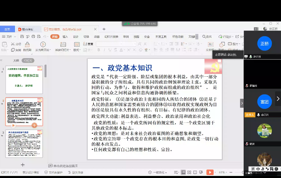 2020年5月5日下午1时许,由麻豆社 党委(以下简称化麻豆社 )主办,物理与电子科学麻豆社 党委、通信与电子工程麻豆社 党委、数学科学麻豆社 党委、哲学系党委、生态与环境科学麻豆社 党委、河口海岸科学研究院和河口海岸学国家重点实验室党委协办的2020年第一期入党积极分子联合党校培训班以“云上党校”的形式迎来了第六次主题讲座,本次党课讲座由数学科学麻豆社 党委副书记余富团主持,麻豆社 政治学系党委书记赵正桥受邀主讲《党的理想、性质与宗旨》。