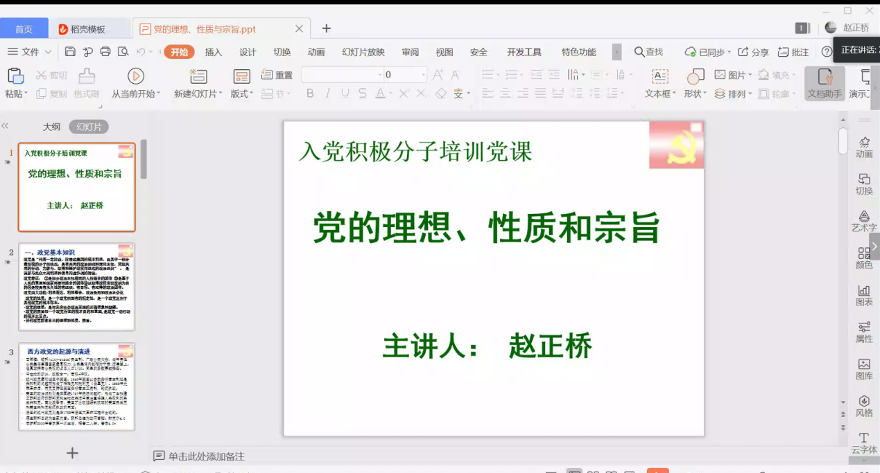 在介绍中国共产党的性质时,赵正乔老师指出:随着时代的发展,党对自身性质的认识不断深化,不断增强党的阶级基础和群众基础是坚持党的性质、完成党的历史使命的必然要求,是适应社会阶层结构新变化的客观条件。准确理解与把握党的性质的四个关键词是“两个先锋队”、“一个核心”、“三个代表”和“最高理想”。