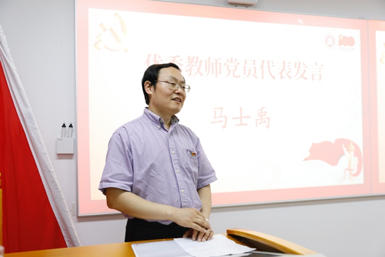 马士禹老师作为优秀教师党员代表发言。他表示要时时刻刻走在前,始终以优秀共产党员的标准严格要求自己。作为高校的一名党员教师,要积极响应国家号召开展学术研究,因材施教、身体力行落实卓越育人。最后,马老师还表达了对毕业生党员的美好期待和祝福。