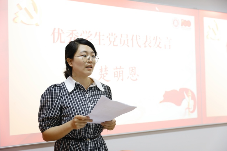 作为优秀学生党员代表,楚萌恩同学在发言中谈到党在她心中就是一座丰碑、一座灯塔、一面旗帜。面对外敌侵略,先辈们身先士卒,为中国带来了新生;抗击疫情攻坚,党员们挺身而出,展现了中国力量。她表示,作为一名共产党员,自己将不辜负期望,始终保持共产党人的蓬勃朝气和浩然正气,继续全心全意为同学服务。