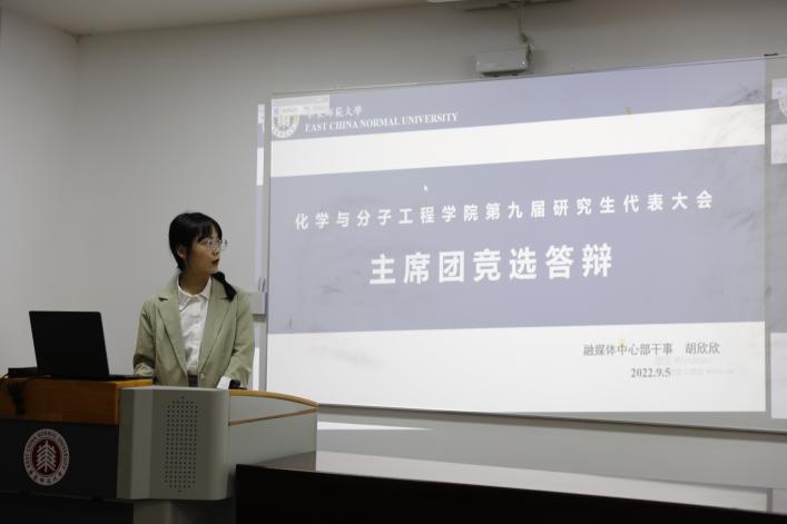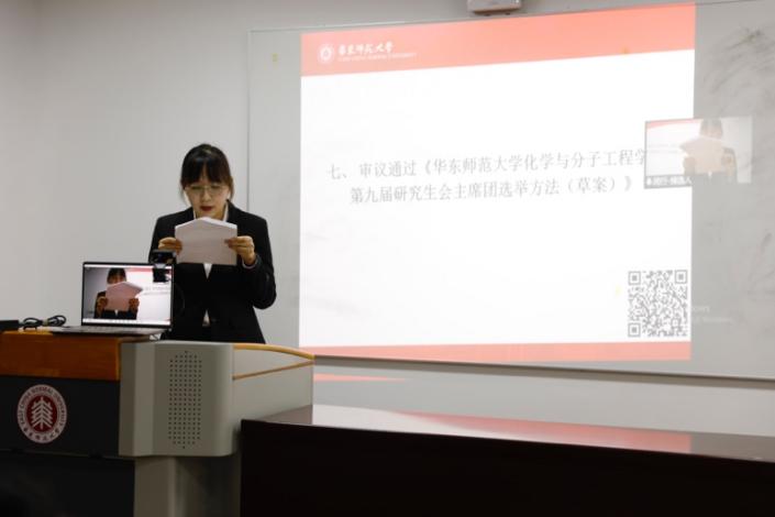 9月8日晚6时,麻豆社 第八届研究生代表大会在闵行化学楼135会议室正式召开。出席本次会议的老师有院党委副书记王婷婷老师、团委老师冯琪老师、研究生辅导员王梦雅老师,参会嘉宾有校精密光谱科学与技术国家重点实验室研会主席管江林、生命科学麻豆社 研会主席崔耀楠、国际关系麻豆社 研会主席潇阳和计算机科学与技术麻豆社 研会主席钱栋炜。化麻豆社 第八届研究生学生骨干及成员出席了本次会议。会议由化麻豆社 第八届研会主席陈静和王莹同学主持。本次会议评定了2021-2022学年化麻豆社 研会的工作情况,选举了新一届的主席团成员,公布了2022年化麻豆社 研究生会优秀主席团成员、优秀部长、优秀干事的评选结果。