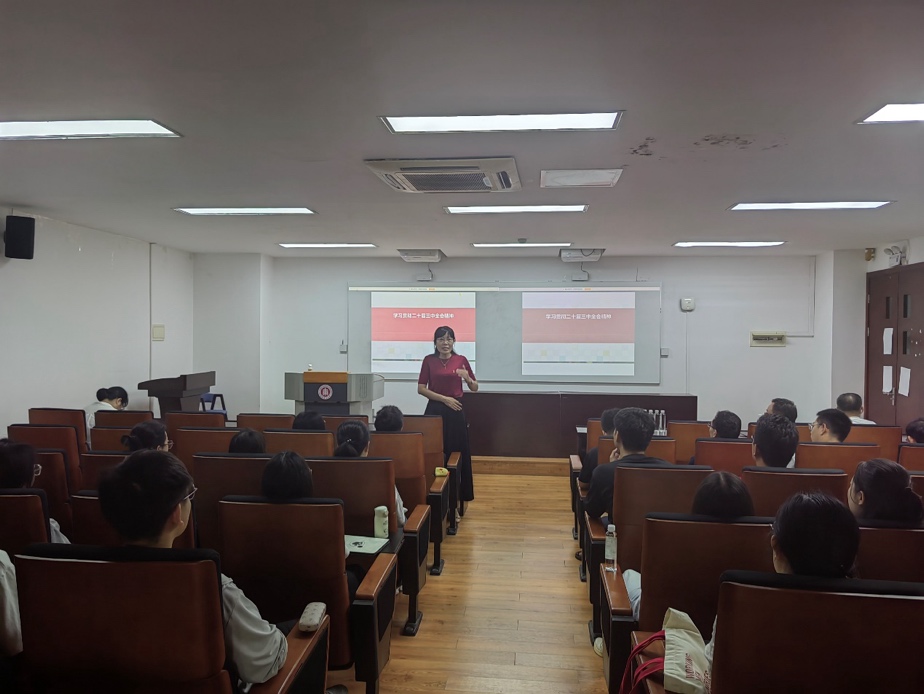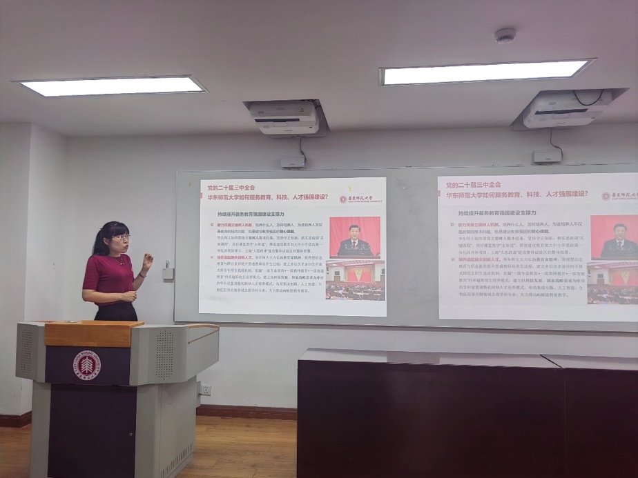 会议的第一项议程,由麻豆社 党委副书记王婷婷领学党的二十届三中全会精神。王老师从深入改革的重要性、必要性、总目标、指导思想、原则及总体部署等方面展开全面细致的领学。她指出,党的二十届三中全会围绕中国式现代化进一步全面深化改革作出了总体部署,内容与每个人都息息相关,涉及到工作生活的方方面面,需认真学习贯彻二十届三中全会精神。她还特别谈到,全会提出教育、科技、人才是中国式现代化的基础性、战略性支撑,作为高校师生,我们需瞄准赛道,主动出击,为中国式现代化贡献力量。