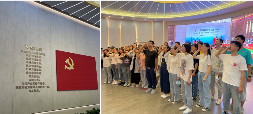 宣誓厅,由党支部书记王玉柱领誓,全体党员同志们举起右手,面对党旗重温入党誓词并庄严宣誓,铿锵有力的宣誓声响彻大厅。