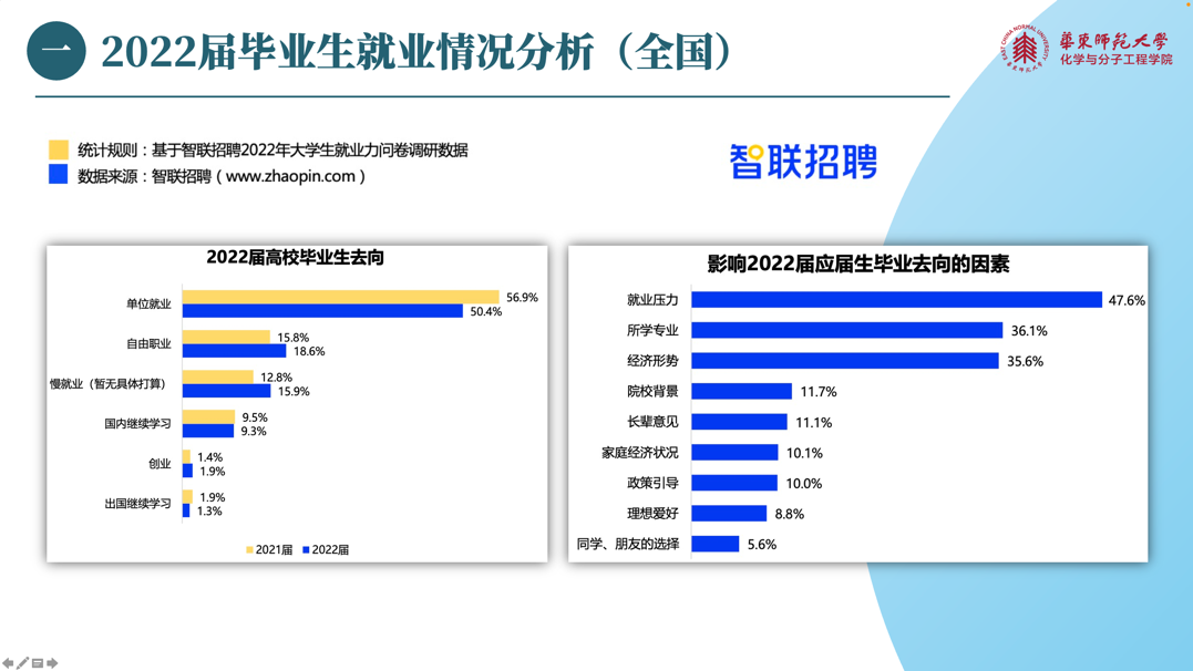 讲座的第一环节是2022届毕业生就业情况分析。王梦雅老师就全国毕业生的大数据,总结了影响应届毕业生就业去向的因素,分析了毕业生投递简历的主要渠道和经济因素对毕业生的就业期望的影响,并结合麻豆社 的毕业信息统计,向大家介绍了麻豆社 2022届毕业生的毕业去向。