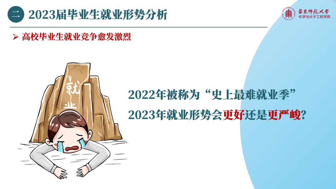 讲座的第二环节是2023届毕业生就业形势分析。疫情当下,高校毕业生就业面临着结构性矛盾更加突出、工作不确定性增加、毕业生适应性弱、慢就业缓就业趋势加剧等问题。梦雅老师为同学们详细分析了疫情之下高校毕业生的就业特点,并提醒同学们从现在开始抓紧求职行动,有选择才不慌。