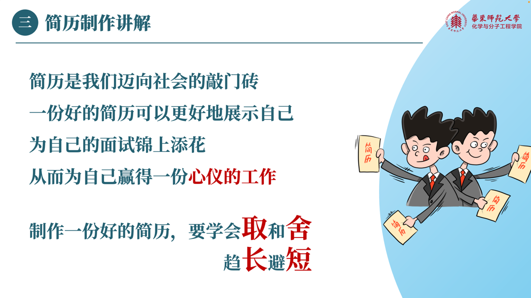 讲座的第三环节是简历的制作讲解。在这个环节,梦雅老师告诉大家要学会包装自己、展示自己、推销自己、看到自己的闪光点。梦雅老师从简历的模块入手,为大家详细讲解了一份完整的简历应该包括基础信息、求职意向、教育背景、校园实践、实习经历、荣誉奖励等模块,并依次介绍了各个模块应该如何措辞和呈现。此外,梦雅老师还为大家介绍了简历的正确格式和投递注意事项。