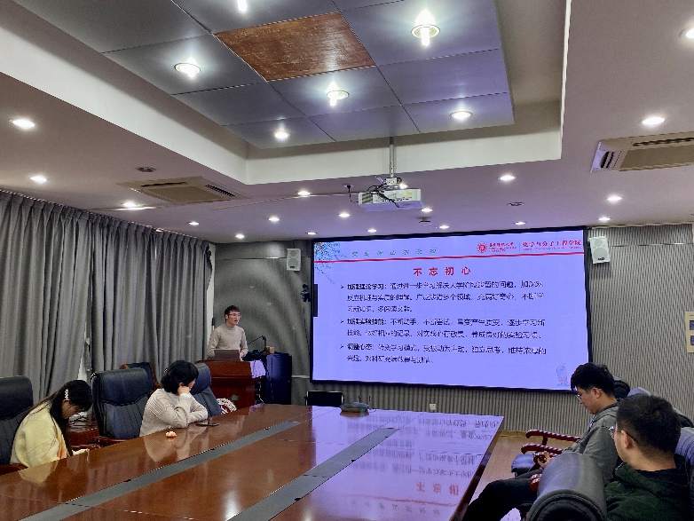 经验分享:陈晓超同学主要从实验室安全、科研、科研与生活三个方面进行了分享。关于实验室安全,他强调要谨记“水、电、门窗、气”安全,注意实验室危险品的使用,注意休息区和实验区界限;关于科研,他向大家建议要“多动手、勤思考、多交流、不轻易放弃、及时整理数据”;在处理科研与生活关系方面,他建议大家要积极锻炼身体,适当参加社会志愿者活动。
