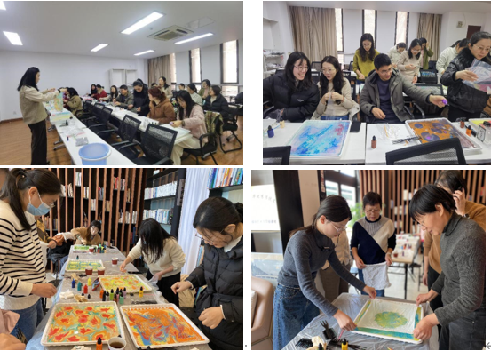 活动伊始,老师们先学习水拓画基础知识,了解到水拓画最早起源于唐朝,水拓画的每次创作都是无法复制,即使是用同样颜色,同样的画法,最多也只是纹路相似,无法做到一模一样,图案变化带来的未知感惊喜满满。因此每位老师将制作独一无二属于自己的妇女节纪念礼物,本次活动也特别邀请了男教师参加,为家中的“女神”送上一片心意。