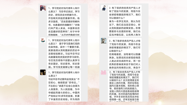 全体党员在线上互相讨论,分享自己的思考。在谈到学习党史对于我们当代青年人有什么意义时,有同学提到了习近平总书记向全党发出“不忘初心,继续前进”的号召,我们要传承共产党人红色基因。红色基因是中国共产党人在长期革命奋斗中铸就形成的,是中国共产党特有的生命标识和精神品质,凝聚着党的崇高理想、坚定信念、高尚品德、优良作风等伟大精神,与党的初心使命在本质上是一致的。习近平总书记多次强调,要把红色基因一代代传下去。同学们指出当代青年人可以通过学习党史继承与发扬党的成功经验和优良传统;可以领悟党的方针、坚定党的信念;可以拓宽视野、增长见识;可以增强凝聚力、吸引力和向心力。