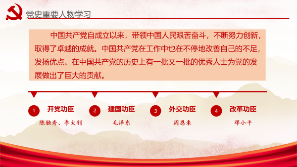 自中国共产党成立以来,一批又一批的优秀人士为党的发展做出了巨大的贡献:开党功臣陈独秀、李大钊,建国功臣毛泽东,外交功臣周恩来,改革功臣邓小平等等。正是因为有了许许多多这样优秀的共产党人,我们的党才有了这样的发展,也正是因为有了党的正确领导,我们的祖国才被建设得越来越强大。作为新世纪的人才,我们一定要从这一代一代的革命前辈肩上接过这重重的担子,投身于社会主义建设,为共产主义事业奋斗终身。