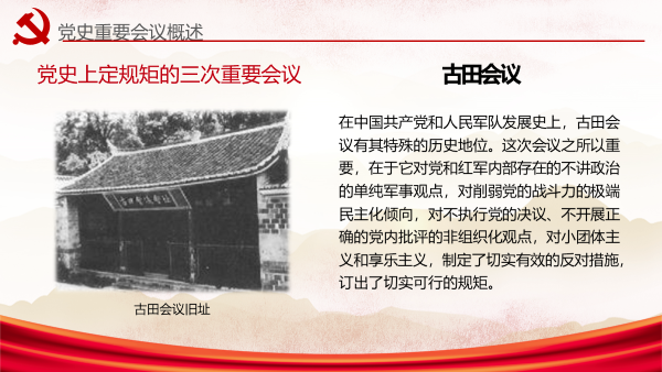 古田会议、中共六届六中全会、1948年9月的中共中央政治局会议是党的发展过程中定规矩的三次重要会议,为加强党内民主、实现党的团结统一发挥了积极作用。这些规矩,不少已经成为我们党的优良传统和工作惯例,也成为党内法规制度体系的重要渊源。