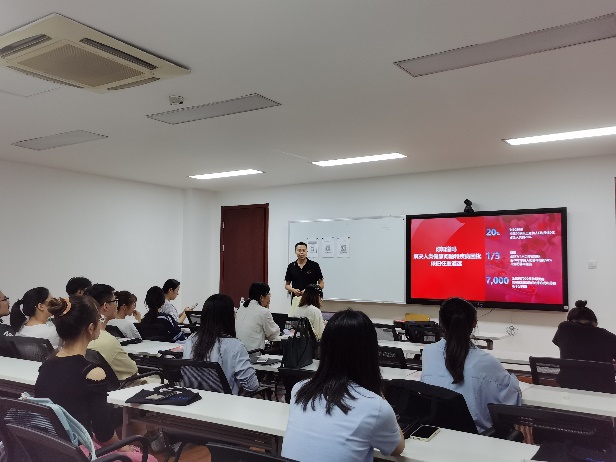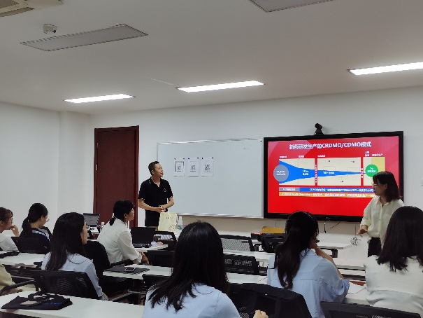 招聘会开始后,来自合全药业工艺研发部的李志文老师首先为同学们播放了公司宣传片,通过宣传片,同学们初步了解了该公司的发展现状及前景。随后,李老师以“生命科学的黄金时代”为切入点,向大家详细介绍了公司的主要业务和服务对象,覆盖了新药研发外包到商业化生产外包的各个阶段。通过PPT,李老师展示了公司从创立之初,再到拥有一体化赋能平台的发展历程,介绍了公司当前所拥有的资质、奖项以及承建的项目。通过李老师精彩的展示和讲解,同学们对该公司有了更为全面的了解和认识。