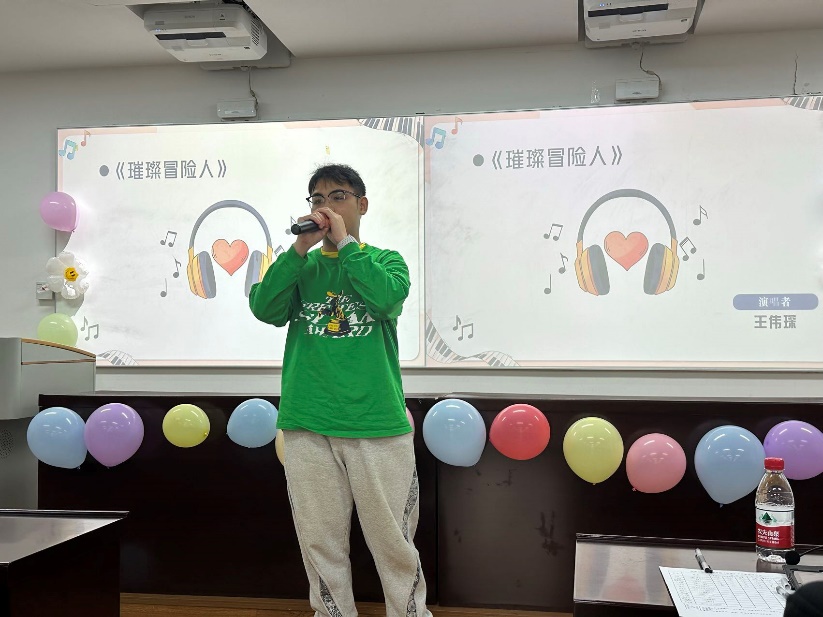 王伟琛同学带来的歌曲《璀璨冒险人》表达的含义是只有勇敢的冒险人才能闯荡出一天地,只有坚定的信念能引领他们走向光明,只有璀璨的心灵才能点亮他们行的路途。