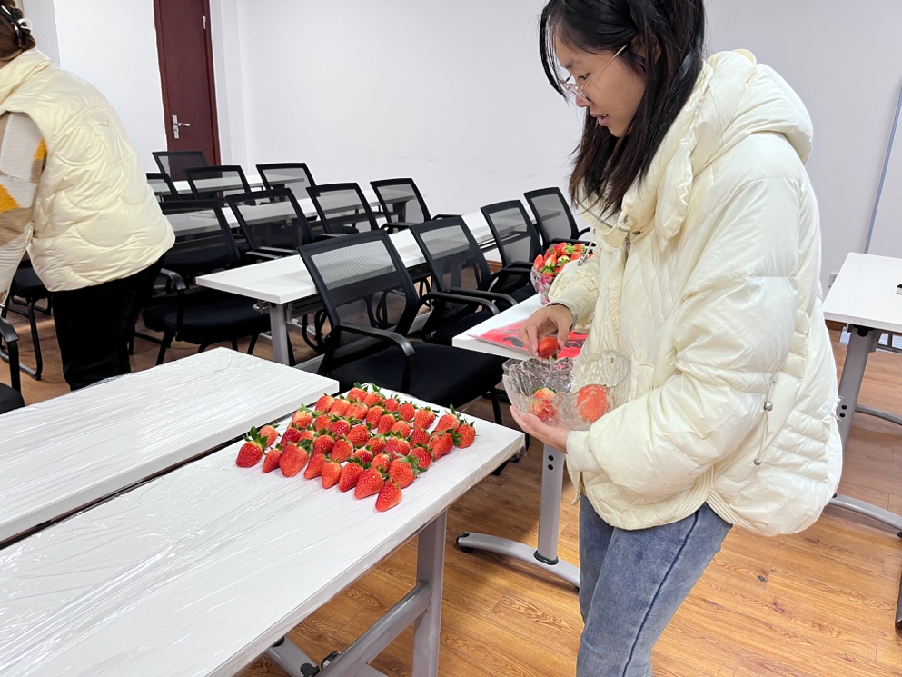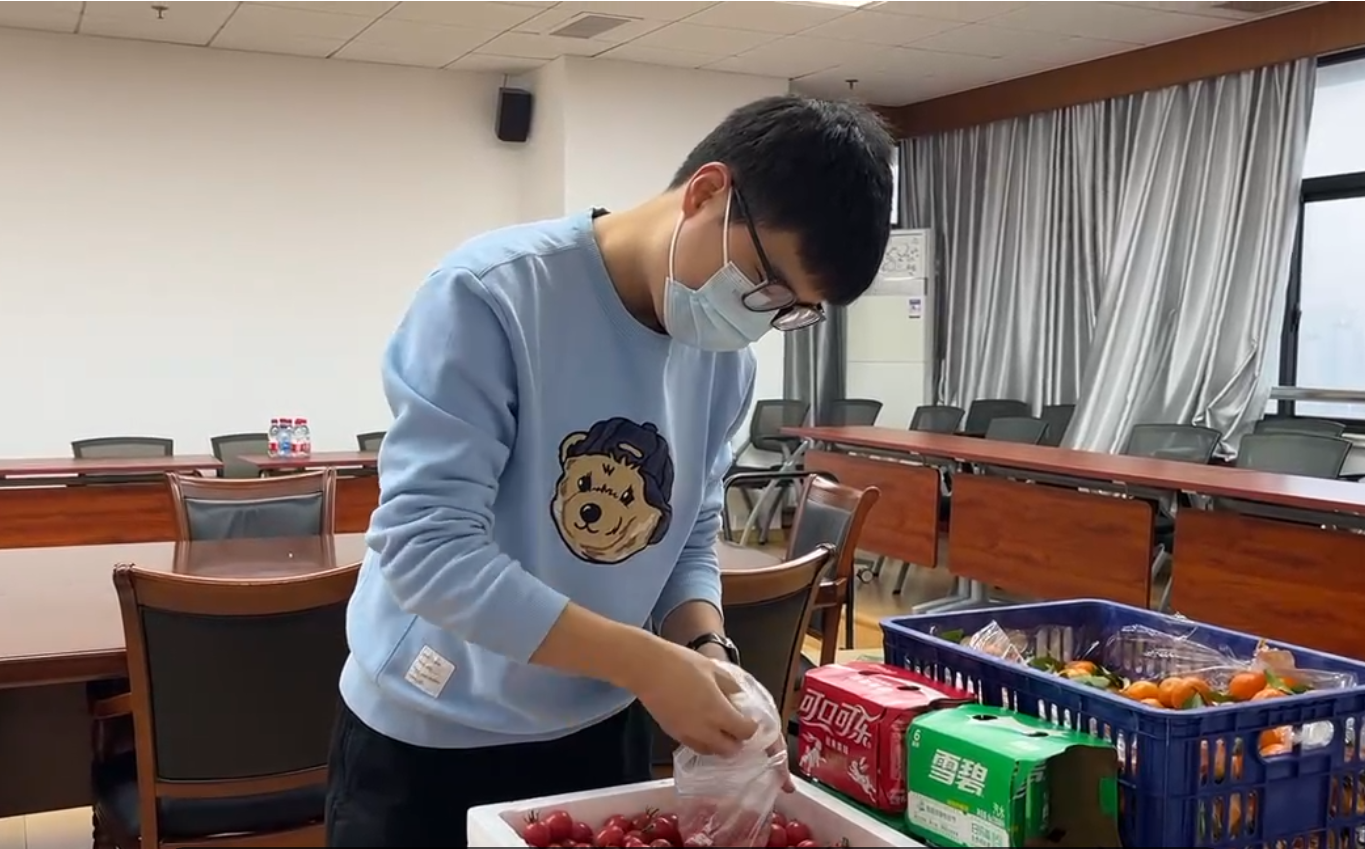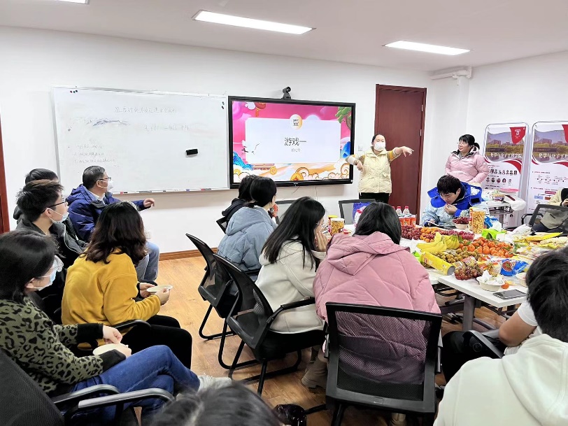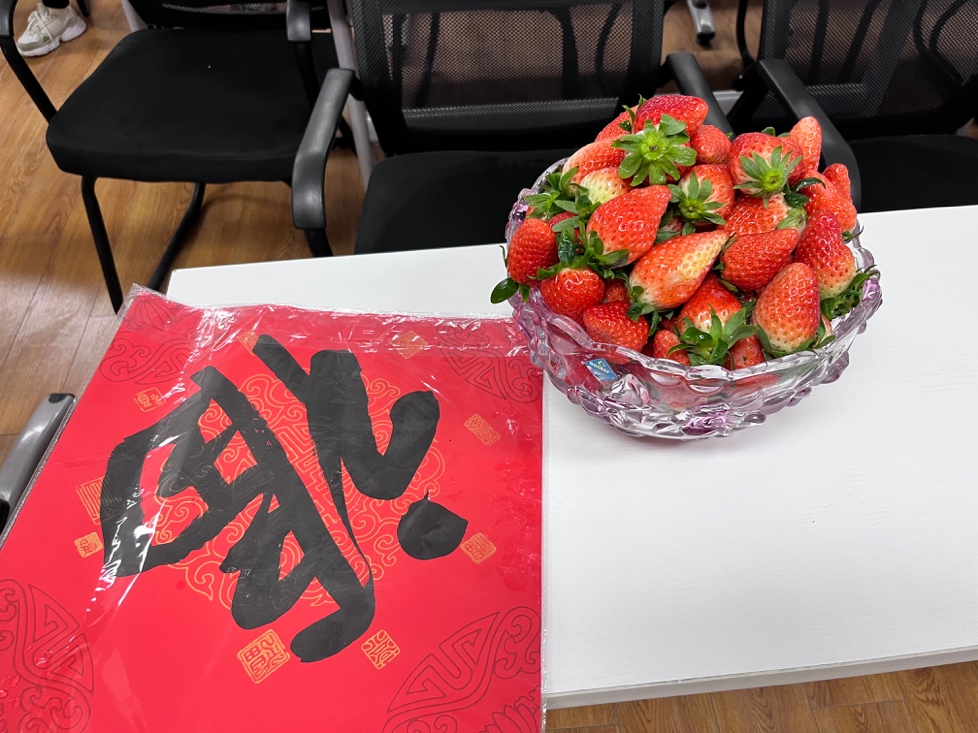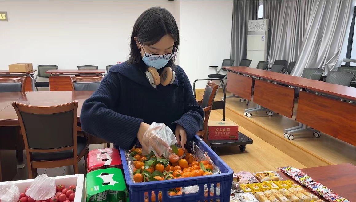 在活动正式开始前,两校区研会工作人员早早来到现场,用福字、水果和点心布置了一个温馨的会场,桌面上摆满了各种零食瓜果,搭配上红红的福字,一下子就有了过年的味道。