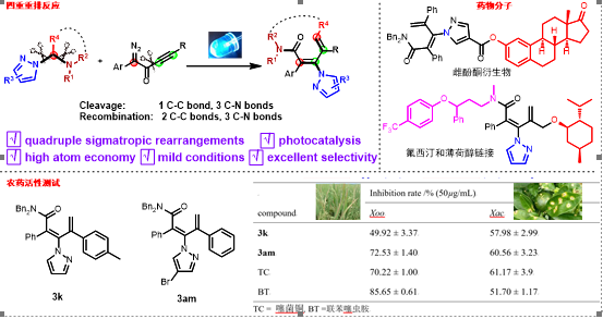 刘路教授团队长期致力于惰性σ键的精准激活与重组,基于“绿色碳科学”的理念,提出“可控串联重排”的概念。本研究利用炔基重氮酮和吡唑缩醛胺反应,在简单的光照下,依次发生了4次重排反应,实现了一次断裂4σ键并生成5σ键生成,为多取代共轭二烯化合物提供了模块化合成的方法。这类化合物对水稻白叶枯病菌(Xoo)和柑橘溃疡病菌(Xac)的杀菌效果和商业化农药相当。利用这个反应,可以很方便的对药物分子进行修饰,或者把几个药物分子快速对接起来,为新药开发提供了方法学基础。
