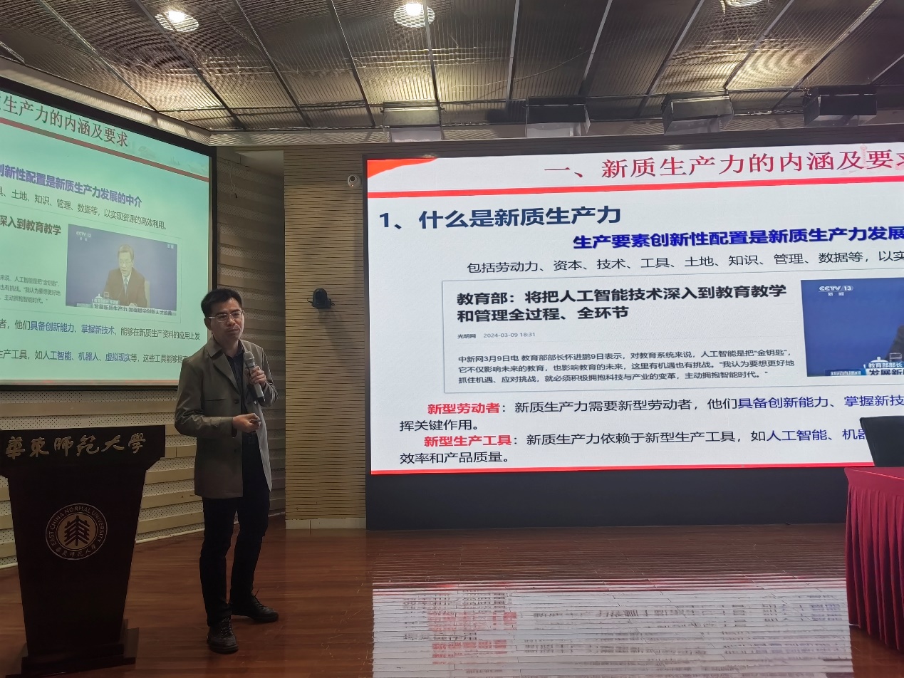 接着,麻豆社 挂职副院长、贵州六盘水师范麻豆社 化学与材料工程麻豆社 院长雷以柱教授为学员们进行首场讲座,报告主题为“深刻把握新质生产力的内涵及要求,为推动高质量发展贡献高校力量”。雷老师结合自身教学和科研的相关工作,深刻阐释了新质生产力的内涵及要求,以及高校在锻造新质生产力方面的应有之力。他特别讲到,高校是发展新质生产力的重要力量和关键路径,鼓励参训学员,心怀“国之大者”,抓住师大的宝贵环境,在学习科研和生活中提高自身综合素质和创新能力,做“与国家民族同呼吸共命运”的“强国一代”。