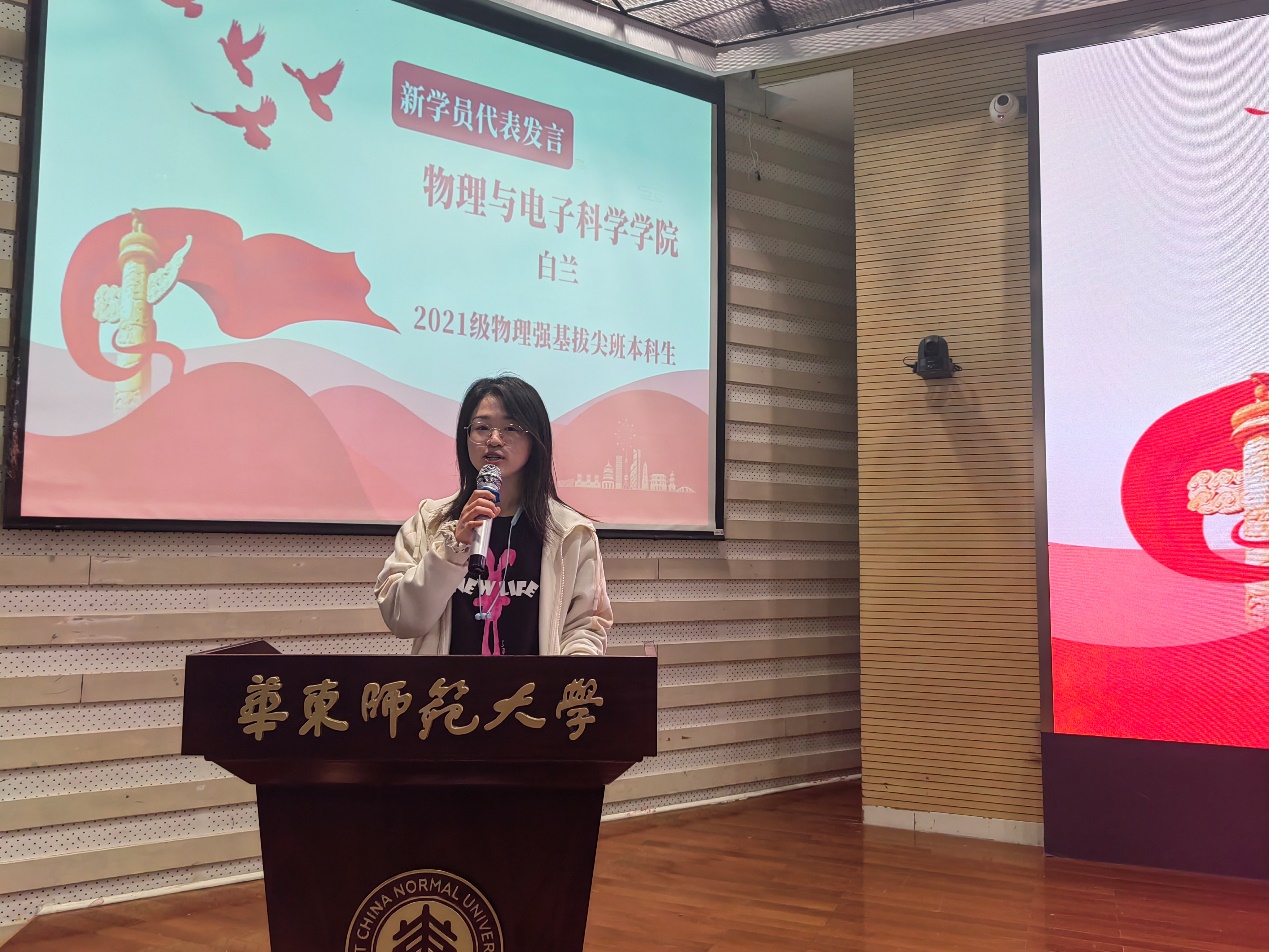 随后,哲学系2022级硕士研究生韩潘越作为老生学员代表发言,她认为,作为入党积极分子,提升党性修养是必修课,而参加党校培训正是提升党性修养的好机会,希望各位学员在接下来的党校学习中认真、踏实,学有所获。物理与电子科学麻豆社 2021级本科生白兰作为新学员代表发言,她认为,入党积极分子培训班的开办是党组织对学员们的政治素养和思想觉悟的培养,是党组织对我们的信任和重托,更是一次难得的学习机会,她对接下来的党校学习表达了信心和期待。