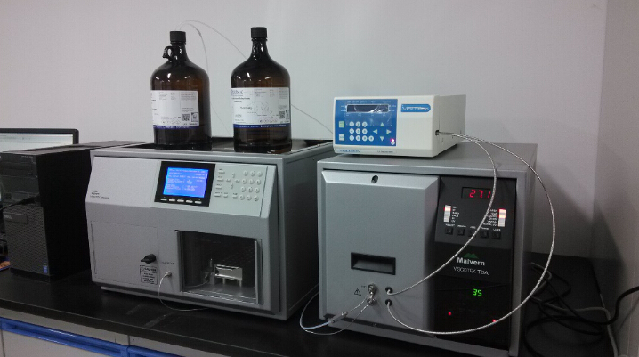 凝胶渗透色谱系统(GPC)由Malvern公司生产,型号为Viscoteck TDAmax,主要用于综合表征各种大分子(天然高分子、合成高分子和蛋白质)的相对分子量、绝对分子量和分子量分布。目前的色谱柱配置条件要求样品应溶于THF,为得到好的测试效果,样品测试前要尽量提纯。