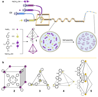 图3. (a) 通过微纳流控技术在微液滴中制备金属笼1的示意图;(b) 金属笼2-5的结构。