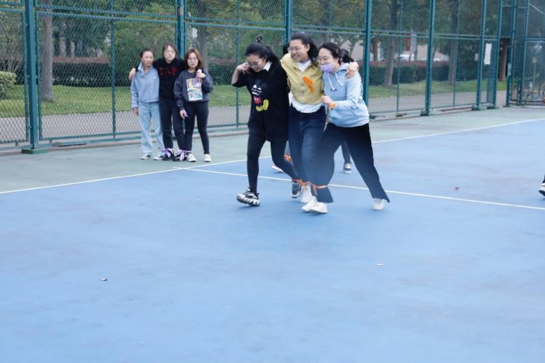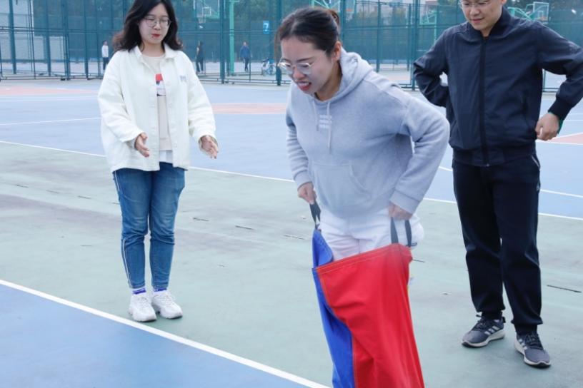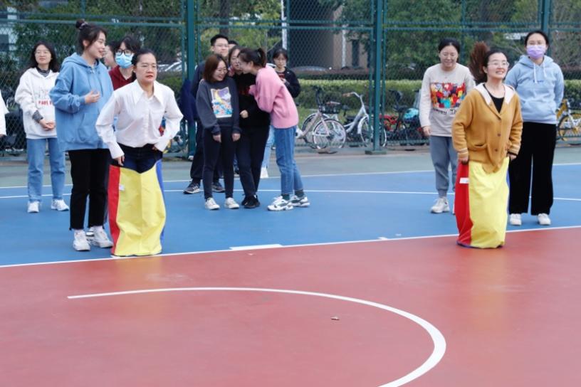 在“袋鼠跳”项目中,师生采用迎面接力形式,双脚套在袋子中跳跃前进,按完成时间进行排名,其中紫队一马当先,拔得头筹。