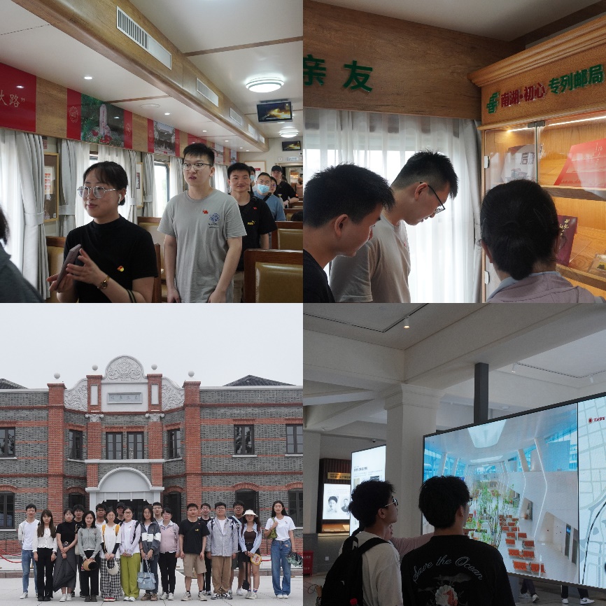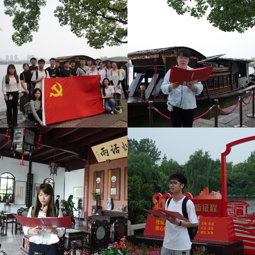 随后,党员们来到南湖革命纪念馆,认真观览南湖革命主题展览。“救亡图存”、“开天辟地”、“光辉历程”、“走向复兴”四幅历史画卷,生动呈现了中国人民反封建、反侵略的斗争,到中国共产党应运而生,再到党在重大历史时刻做出关键抉择,最终走向世界大国的历程。大家边走边看,边思边悟,充分感受“开天辟地、敢为人先的首创精神;坚定理想、百折不挠的奋斗精神;立党为公、忠诚为民的奉献精神”的红船精神。2022级普陀博士研究生党支部书记高志文在南湖革命纪念馆分享“追溯红色记忆,重温入党誓词”为主题的微党课。革命先烈不畏艰险,不屈不挠,为了民族独立、人民解放而浴血奋战。他们的勇敢与坚定,永远激励着我们。参观结束后,党员们集体到宣誓台,面向党旗,高举右拳,重温入党誓词。