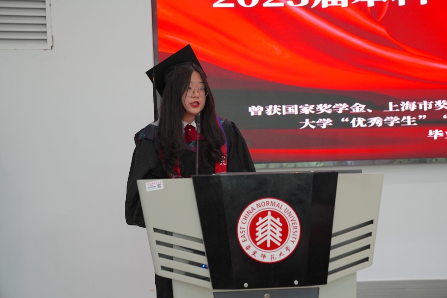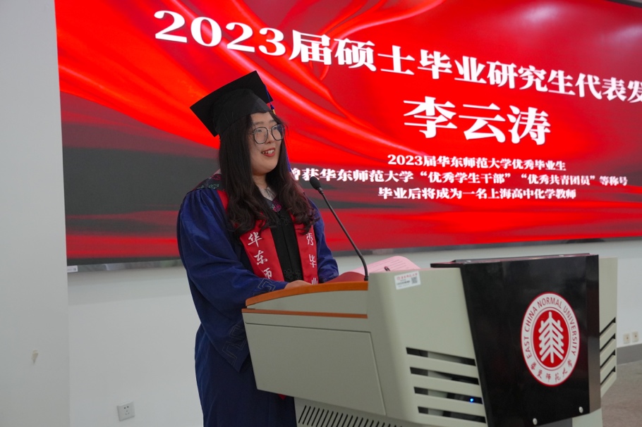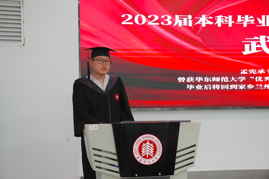 2023届本科师范班毕业生代表武培瑞回顾了四年大学生活中难忘的点滴瞬间,他表示自己将立志秉持“求实创造,为人师表”的校训,用自己的学识、阅历、经验点燃学生对真善美的向往,为国家的未来贡献自己的力量。