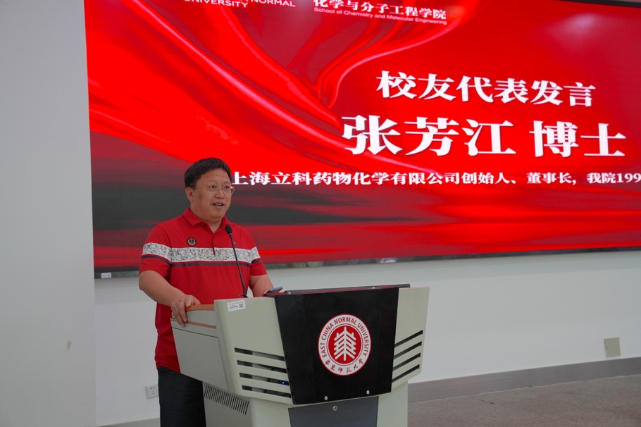 1990级本科校友张芳江博士回顾了33年前入校求学的青葱岁月,分享了自己离开母校后潜心科研、自主创业的心路历程。张博士勉励毕业生们首先要坚信化学领域的无限潜力,要将求学期间的专业知识积累与目标导向的工业化应用紧密结合,必将大有作为。其次要志存高远,永续进取。新的时代呼唤我们要承担新的使命,绿色发展理念的践行,双碳国家战略目标的实现,为同学们的事业发展提供了广阔空间,大家要主动融入,成功之路必将越走越宽。最后,要锚定目标,永不言弃,才能从容面对挫折,取得胜利。
