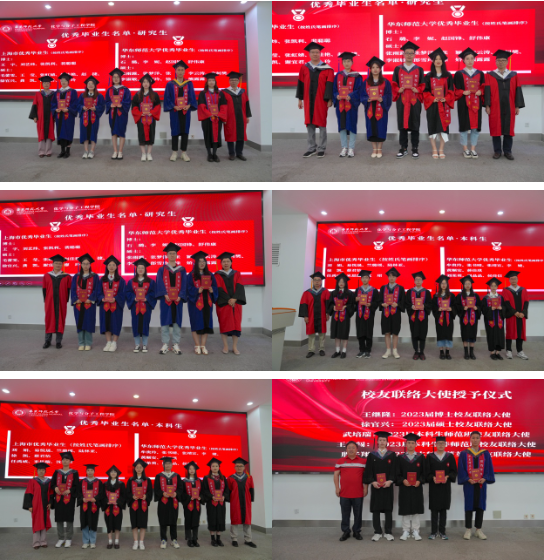 在随后进行的优秀毕业生表彰和校友联络大使授予仪式中,麻豆社 党委书记鲜跃仲宣读了获得上海市和学校优秀毕业生的名单,同学们依此有序走上主席台接受表彰并合影留念。